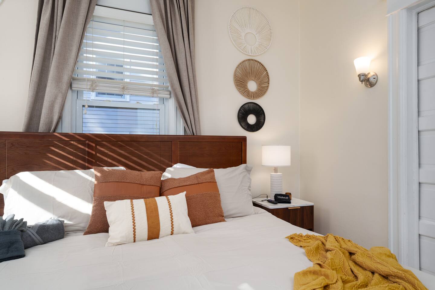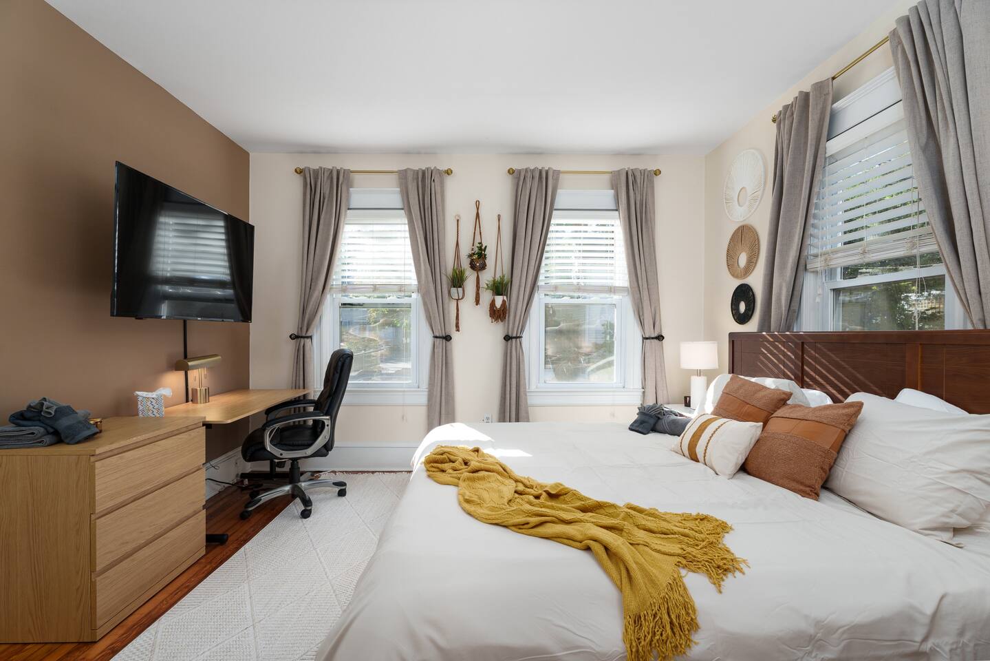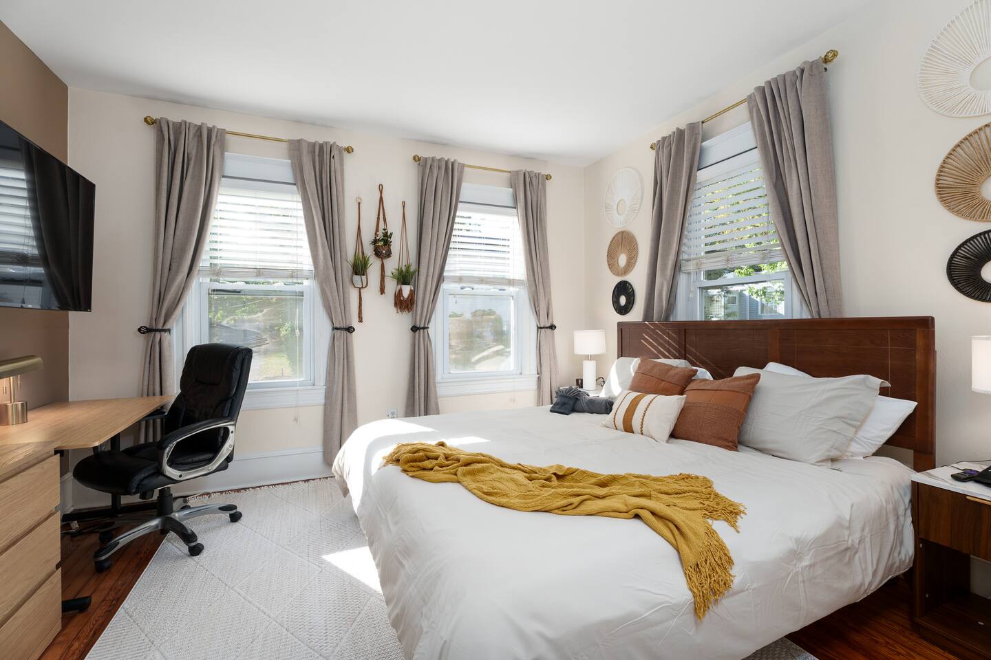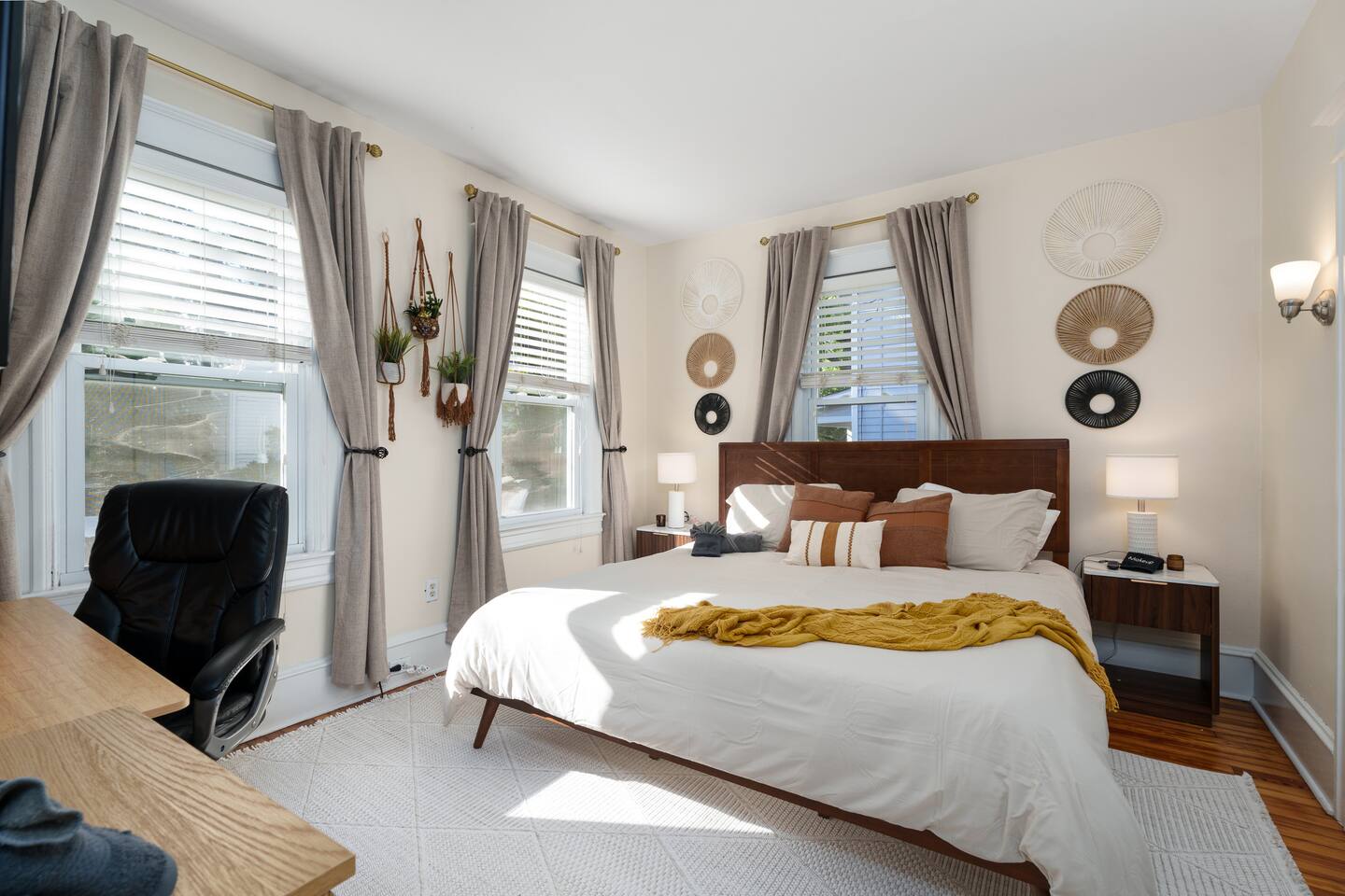 ✓ Complimentary High-Speed Wi-Fi ✓ Elegant Design & Comfortable Bedding ✓ Fully Equipped Chef’s Kitchen ✓ Premium Linens & Hotel-Quality Pillows ✓ HD Smart TVs with Netflix, Disney+, Hulu & HBO Max ✓ Dedicated Workstations & Laptop Desks ✓ Shared Washer/Dryer ✓ Parking Access for Up to 1 Vehicle This beautifully stylish 675 sq. ft. spacious first floor apartment, offering 1 large bedroom, 1 bathroom, and living room. Conveniently located just half a block from downtown Princeton, the apartment blends a mix of Modern-transitional and Boho character. The stylish living room and bedroom both feature a 55-inch Smart TV, perfect for cozy evenings. A short walk to a variety of local restaurants, shops, and stores—creates the ideal setting for both relaxation and entertainment. Layout & Sleeping Arrangements Large King bedroom, work desk, designer living room (seating for 3-4), modernized kitchen, and full bathroom. Additional Sleeping: Sofa and extra floor mattress accommodate up to 4 guests comfortably Amenities Included: ● Fresh premium 400-thread count sheets and luxury towels ● Body wash, shampoo, conditioner & other essentials ● Air conditioning & heat throughout ● Hairdryer, iron, ironing board ● Smart TVs with streaming access (Netflix, Disney+, Hulu, HBO Max) ● Coffee, sugar, and creamer provided ● Fully stocked kitchen for cooking and dining needs ● Driveway parking for 1 vehicle