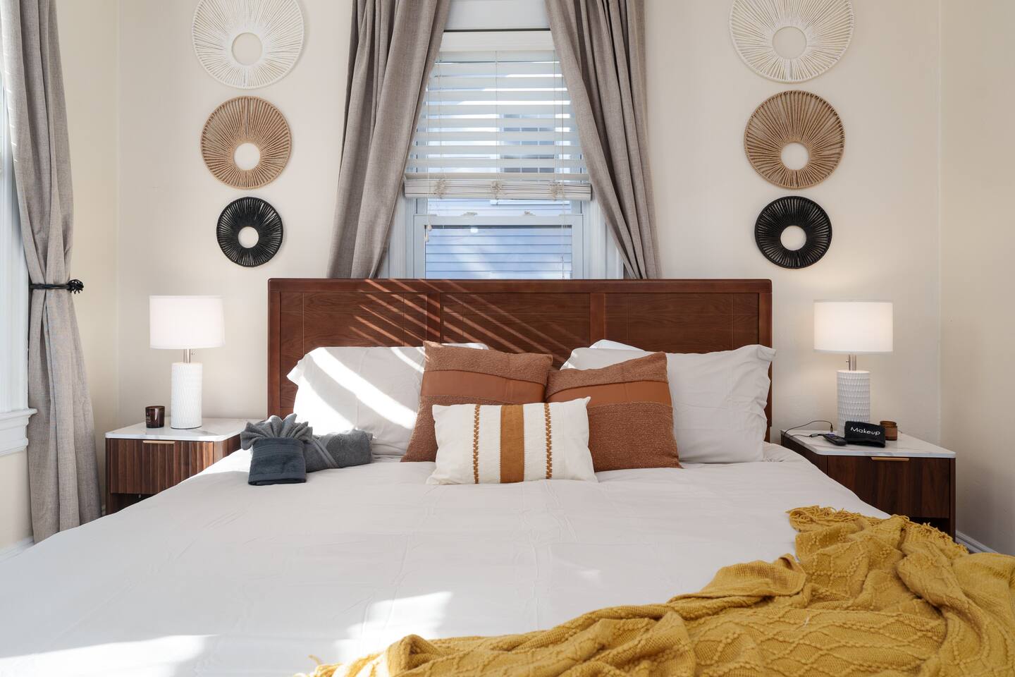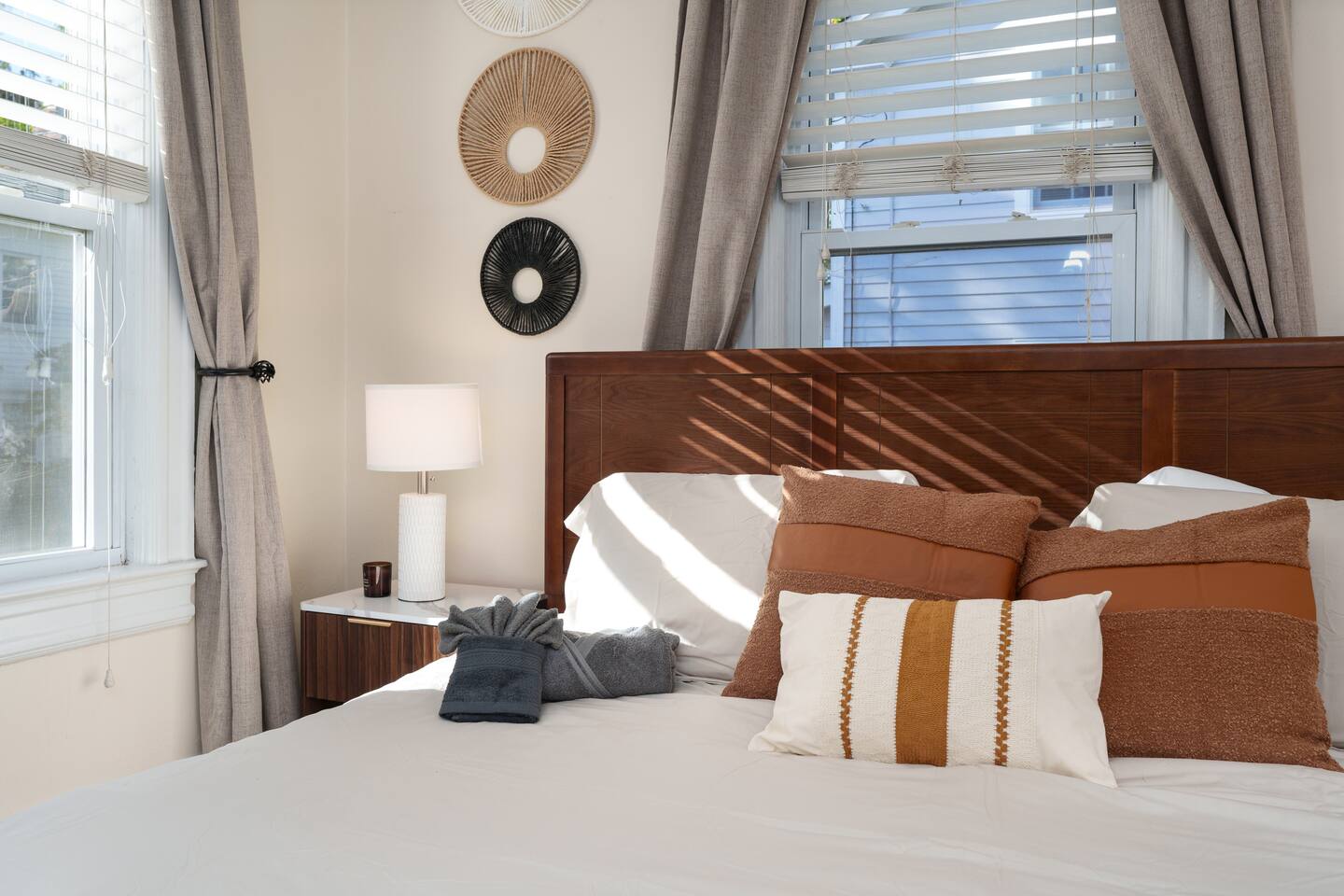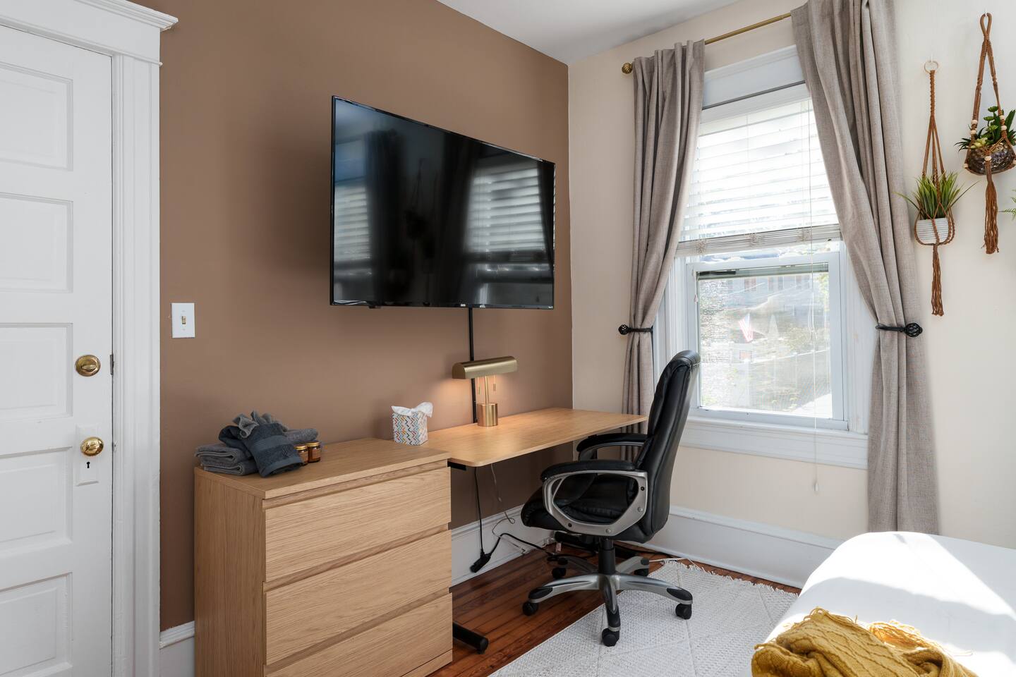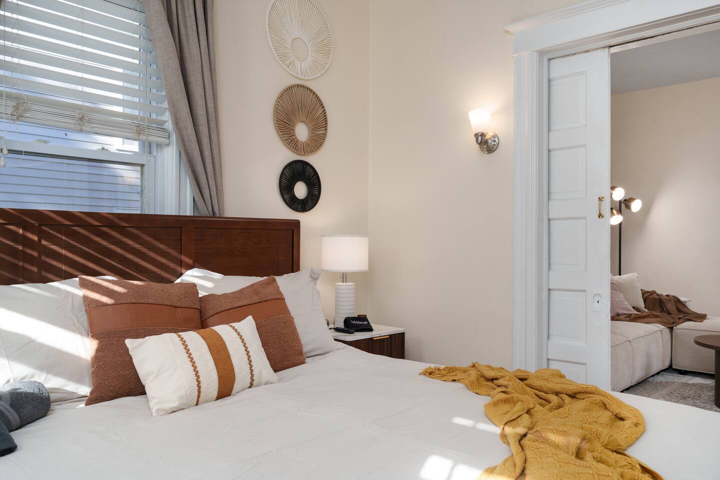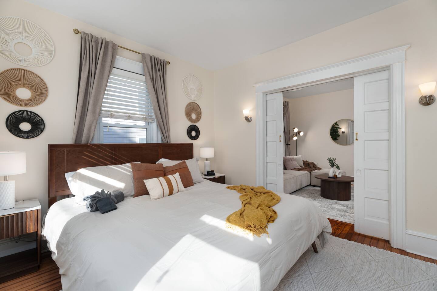 ✓ Complimentary High-Speed Wi-Fi ✓ Elegant Design & Comfortable Bedding ✓ Fully Equipped Chef’s Kitchen ✓ Premium Linens & Hotel-Quality Pillows ✓ HD Smart TVs with Netflix, Disney+, Hulu & HBO Max ✓ Dedicated Workstations & Laptop Desks ✓ Shared Washer/Dryer ✓ Parking Access for Up to 1 Vehicle This beautifully stylish 675 sq. ft. spacious first floor apartment, offering 1 large bedroom, 1 bathroom, and living room. Conveniently located just half a block from downtown Princeton, the apartment blends a mix of Modern-transitional and Boho character. The stylish living room and bedroom both feature a 55-inch Smart TV, perfect for cozy evenings. A short walk to a variety of local restaurants, shops, and stores—creates the ideal setting for both relaxation and entertainment. Layout & Sleeping Arrangements Large King bedroom, work desk, designer living room (seating for 3-4), modernized kitchen, and full bathroom. Additional Sleeping: Sofa and extra floor mattress accommodate up to 4 guests comfortably Amenities Included: ● Fresh premium 400-thread count sheets and luxury towels ● Body wash, shampoo, conditioner & other essentials ● Air conditioning & heat throughout ● Hairdryer, iron, ironing board ● Smart TVs with streaming access (Netflix, Disney+, Hulu, HBO Max) ● Coffee, sugar, and creamer provided ● Fully stocked kitchen for cooking and dining needs ● Driveway parking for 1 vehicle
