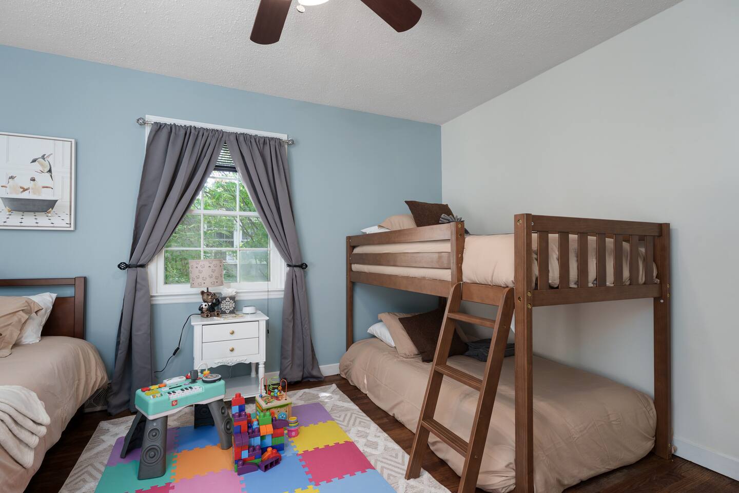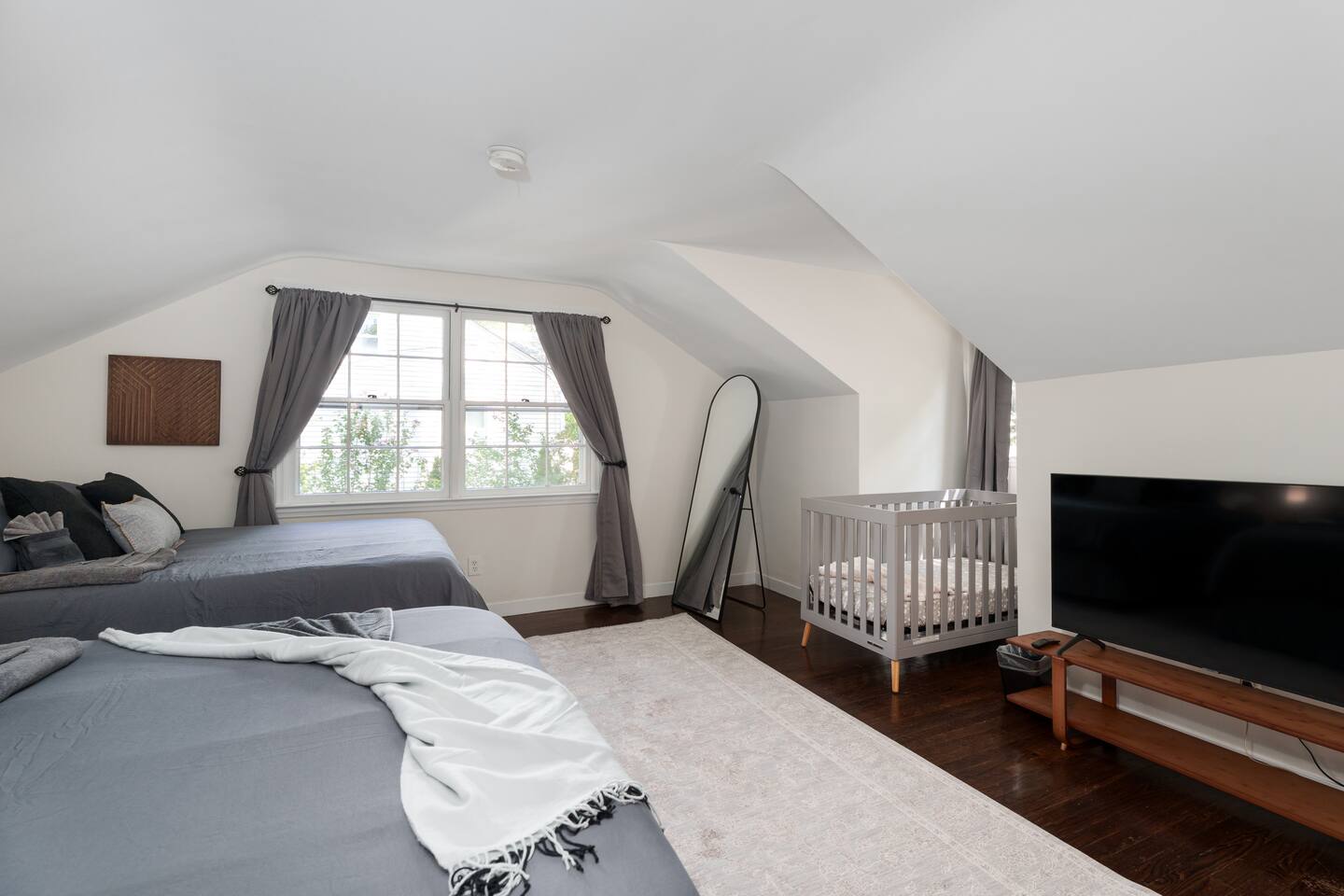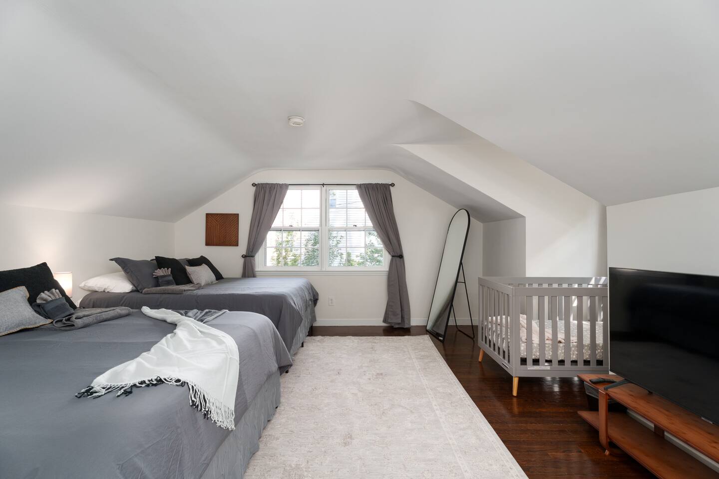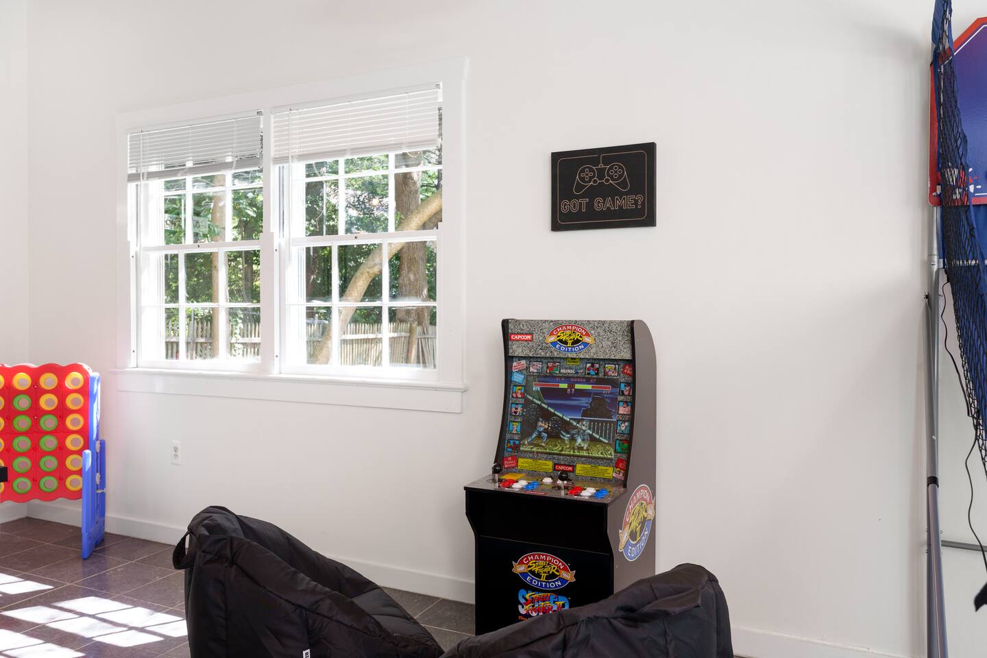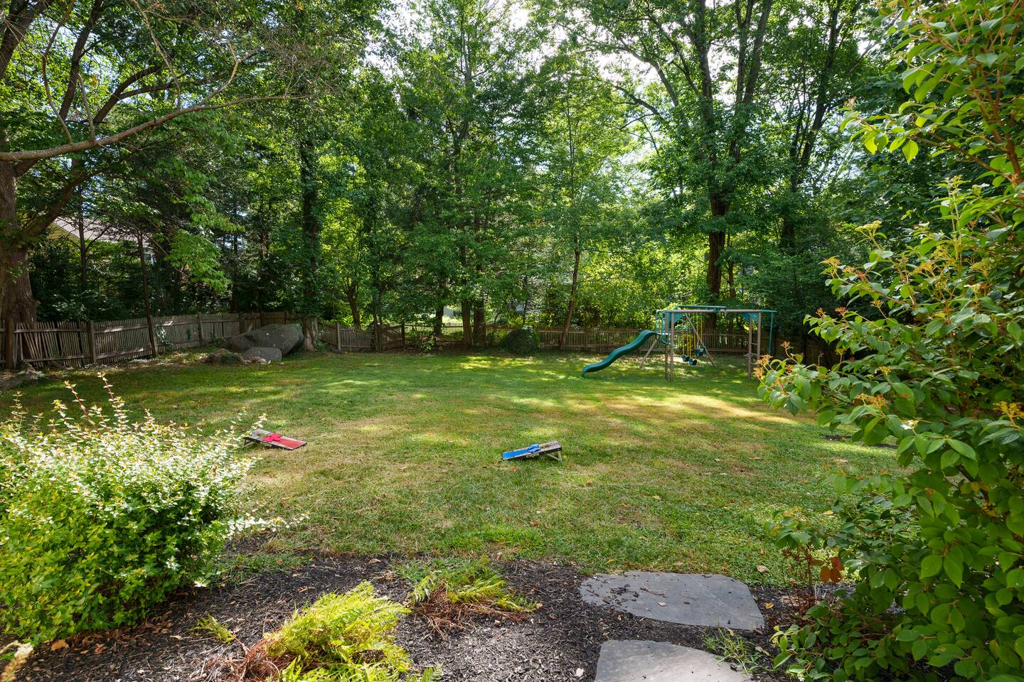 ✓ Complimentary High-Speed Wi-Fi ✓ Elegant Mid-Century Design & Comfortable Bedding ✓ Fully Equipped Chef’s Kitchen ✓ Expansive Gated Backyard with Firepit, Swing Set, BBQ & Patio Lounge ✓ Private Game Room with Pool Table, Basketball, Arcade & Karaoke ✓ Premium Linens & Hotel-Quality Pillows ✓ HD Smart TVs with Netflix, Disney+, Hulu & HBO Max ✓ Dedicated Workstations & Laptop Desks ✓ In-Home Washer/Dryer ✓ Driveway Parking for Up to 4 Vehicles This beautifully updated 2,150 sq. ft. home spans three levels, offering 4 bedrooms, 2.5 bathrooms, and multiple living spaces. Conveniently located just minutes from downtown Princeton and Princeton University, the home blends mid-century character with modern luxury. The stylish living room features a 55-inch Smart TV and an electric fireplace, perfect for cozy evenings. A private laundry room and gym area provide added convenience, while the spacious backyard—with patio seating, fire pit, swing set, and BBQ—creates the ideal setting for both relaxation and entertainment. Layout & Sleeping Arrangements Ground Floor: Private gym, laundry room, and garage access. First Floor: Designer living and dining room (seating for 8), modern kitchen, and expansive game room. Second Floor: Master suite with king bed, work desk, and full ensuite bath, Children’s themed bedroom with twin bunk + standalone twin, Additional queen bedroom, and Shared hallway full bath Third Floor: Two queen beds and a full-size crib Additional Sleeping: Sofa and extra floor mattress accommodate up to 12 guests comfortably Amenities Included: ● Fresh premium 400-thread count sheets and luxury towels ● Body wash, shampoo, conditioner & other essentials ● Air conditioning & heat throughout ● Hairdryer, iron, ironing board ● Smart TVs with streaming access (Netflix, Disney+, Hulu, HBO Max) ● Coffee, sugar, and creamer provided ● Fully stocked kitchen for cooking and dining needs ● Driveway parking for 4 vehicles