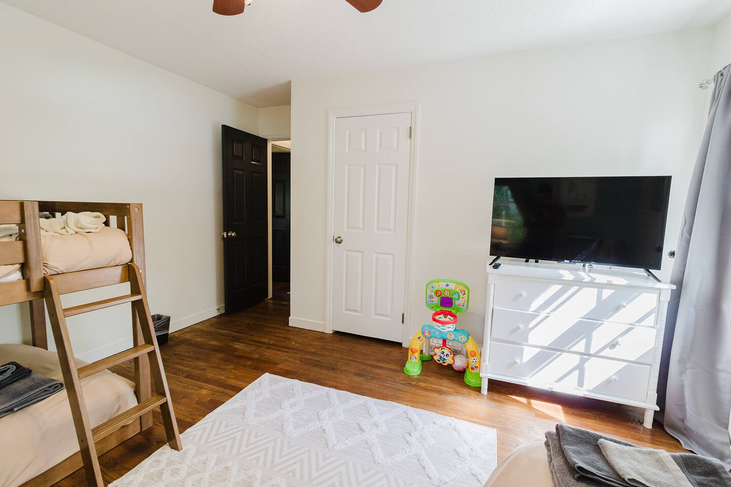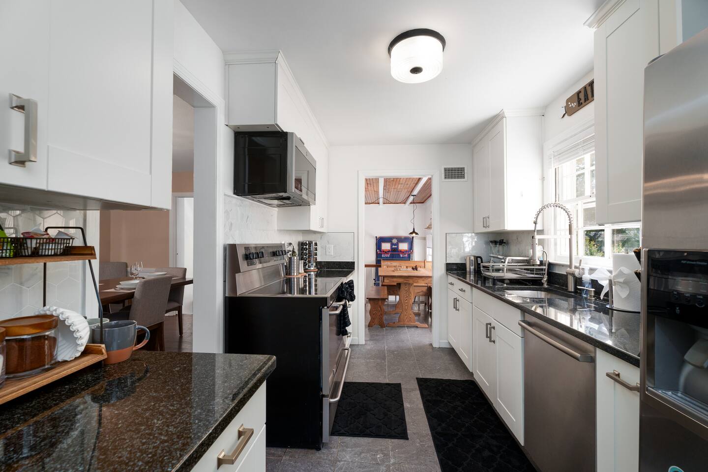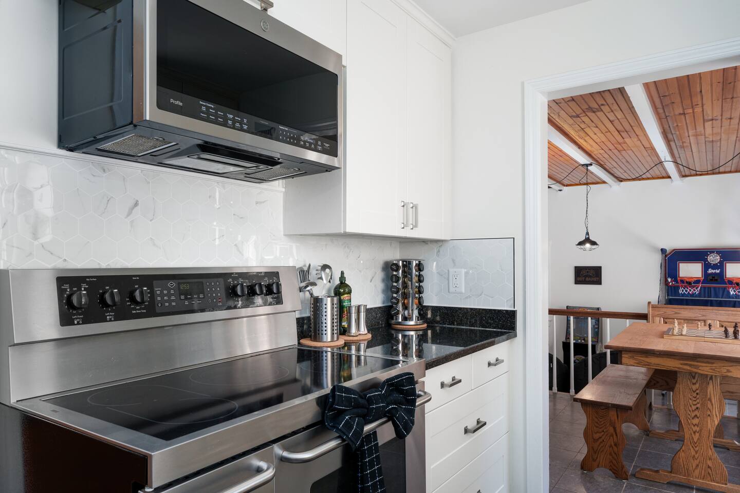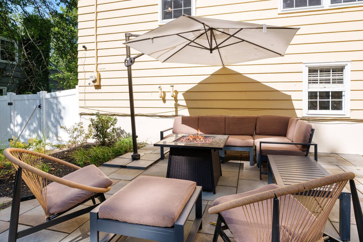 ✓ Complimentary High-Speed Wi-Fi ✓ Elegant Mid-Century Design & Comfortable Bedding ✓ Fully Equipped Chef’s Kitchen ✓ Expansive Gated Backyard with Firepit, Swing Set, BBQ & Patio Lounge ✓ Private Game Room with Pool Table, Basketball, Arcade & Karaoke ✓ Premium Linens & Hotel-Quality Pillows ✓ HD Smart TVs with Netflix, Disney+, Hulu & HBO Max ✓ Dedicated Workstations & Laptop Desks ✓ In-Home Washer/Dryer ✓ Driveway Parking for Up to 4 Vehicles This beautifully updated 2,150 sq. ft. home spans three levels, offering 4 bedrooms, 2.5 bathrooms, and multiple living spaces. Conveniently located just minutes from downtown Princeton and Princeton University, the home blends mid-century character with modern luxury. The stylish living room features a 55-inch Smart TV and an electric fireplace, perfect for cozy evenings. A private laundry room and gym area provide added convenience, while the spacious backyard—with patio seating, fire pit, swing set, and BBQ—creates the ideal setting for both relaxation and entertainment. Layout & Sleeping Arrangements Ground Floor: Private gym, laundry room, and garage access. First Floor: Designer living and dining room (seating for 8), modern kitchen, and expansive game room. Second Floor: Master suite with king bed, work desk, and full ensuite bath, Children’s themed bedroom with twin bunk + standalone twin, Additional queen bedroom, and Shared hallway full bath Third Floor: Two queen beds and a full-size crib Additional Sleeping: Sofa and extra floor mattress accommodate up to 12 guests comfortably Amenities Included: ● Fresh premium 400-thread count sheets and luxury towels ● Body wash, shampoo, conditioner & other essentials ● Air conditioning & heat throughout ● Hairdryer, iron, ironing board ● Smart TVs with streaming access (Netflix, Disney+, Hulu, HBO Max) ● Coffee, sugar, and creamer provided ● Fully stocked kitchen for cooking and dining needs ● Driveway parking for 4 vehicles