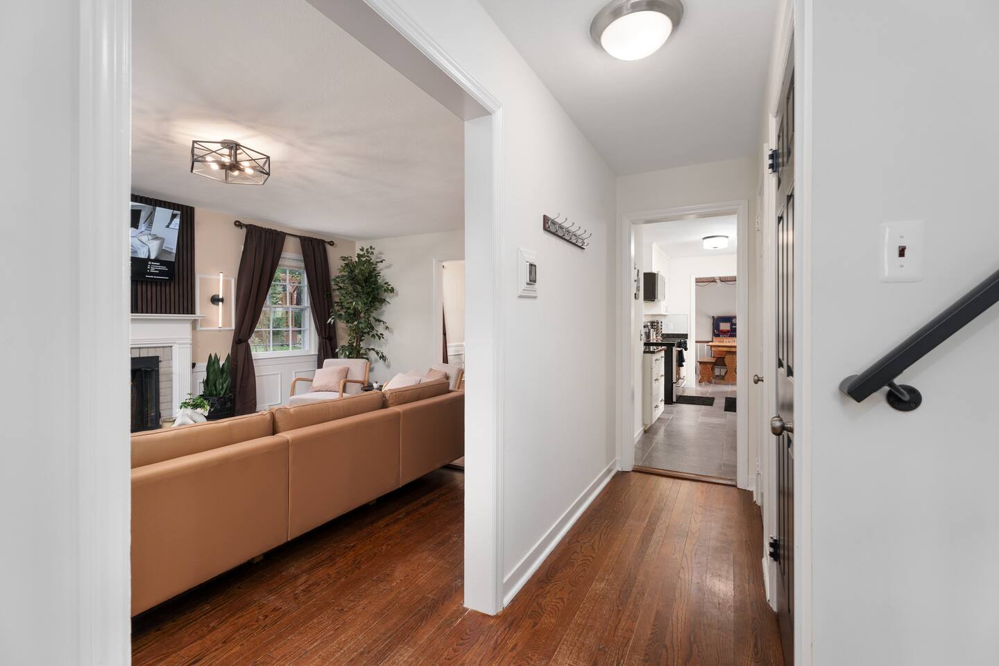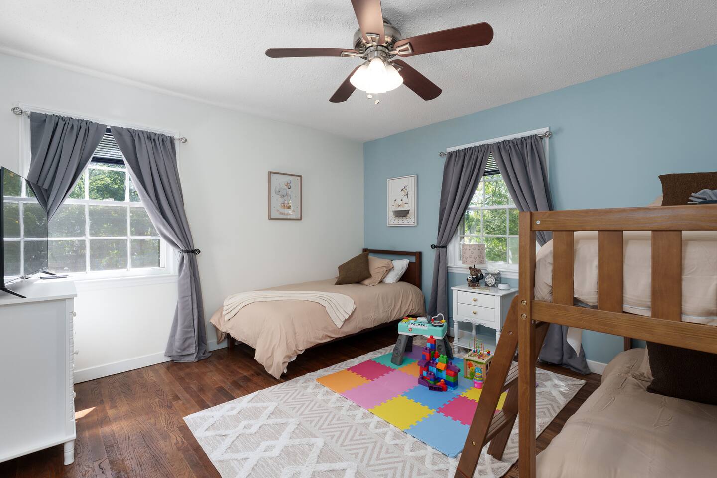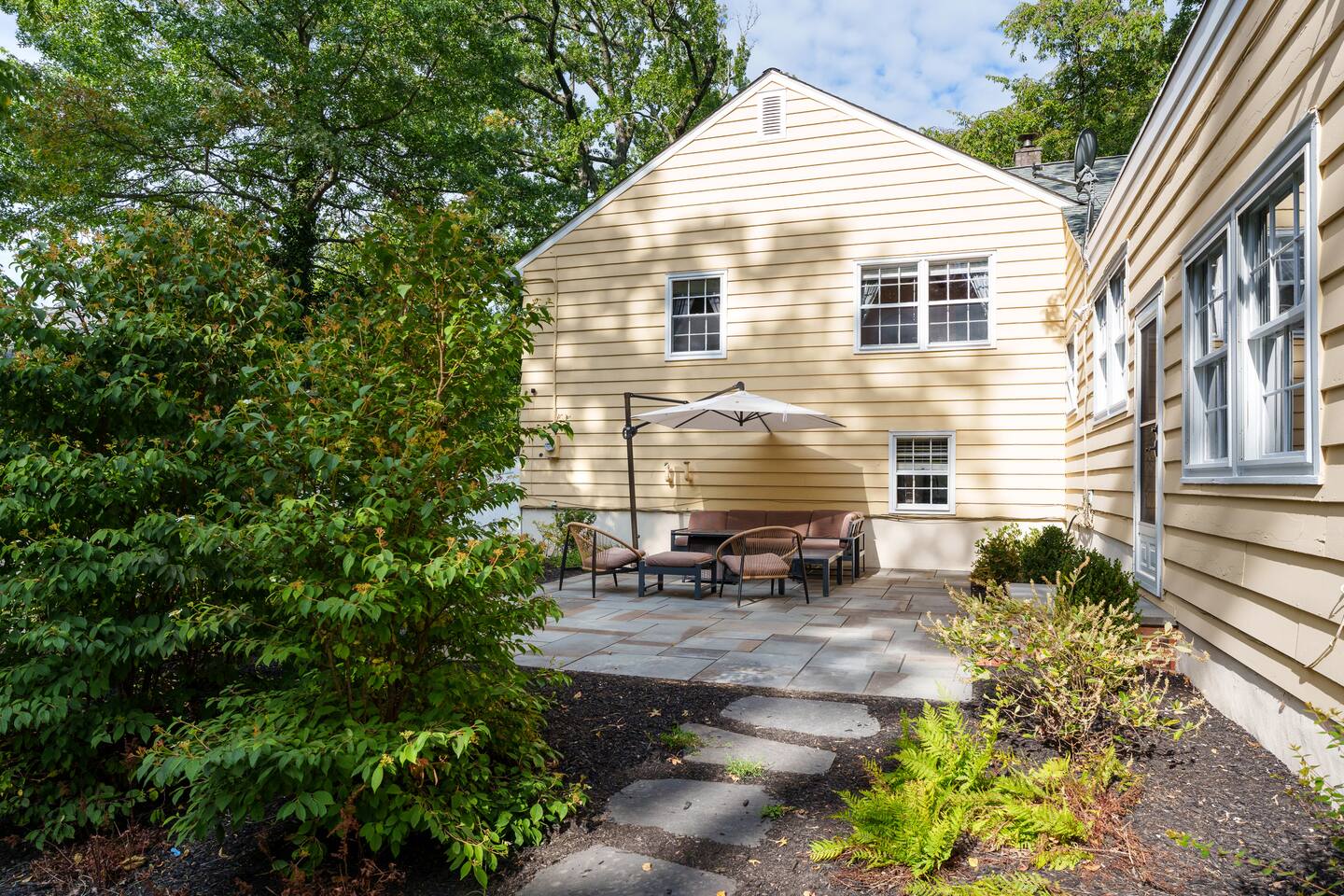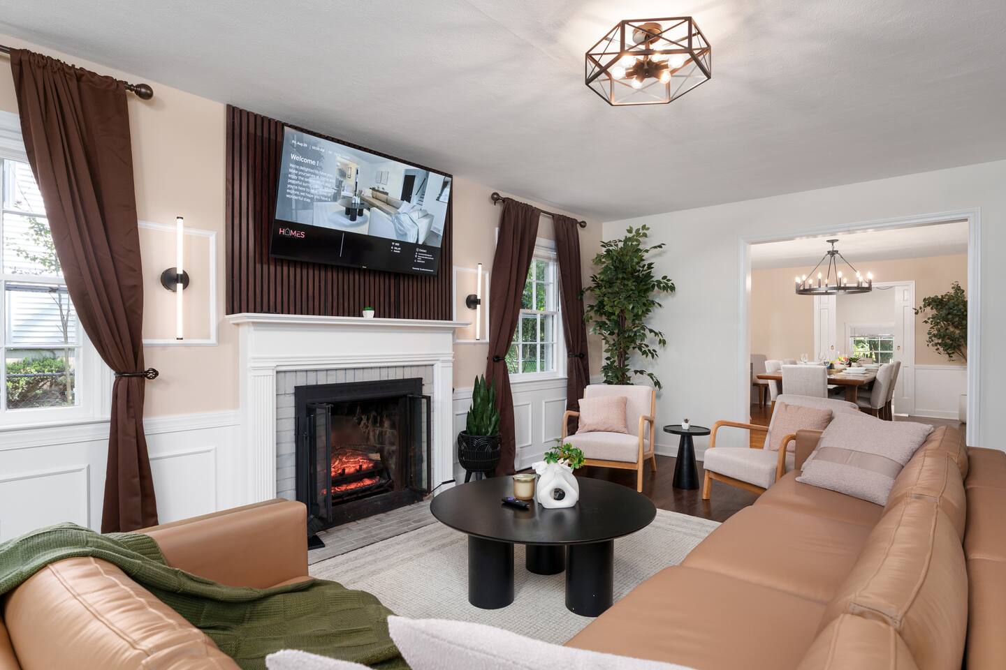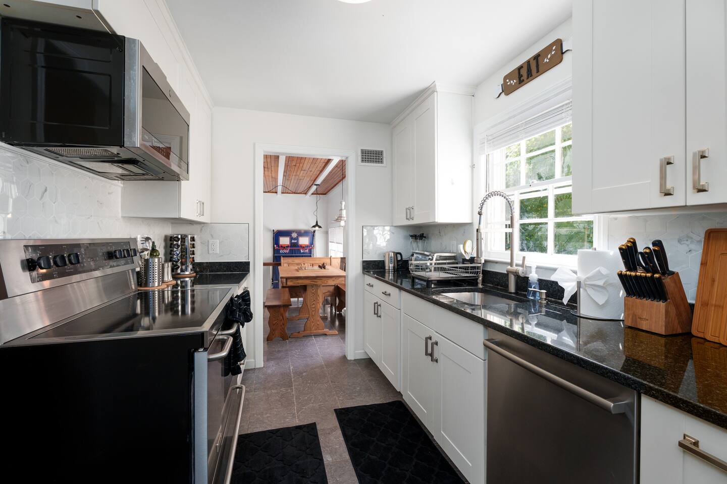 ✓ Complimentary High-Speed Wi-Fi ✓ Elegant Mid-Century Design & Comfortable Bedding ✓ Fully Equipped Chef’s Kitchen ✓ Expansive Gated Backyard with Firepit, Swing Set, BBQ & Patio Lounge ✓ Private Game Room with Pool Table, Basketball, Arcade & Karaoke ✓ Premium Linens & Hotel-Quality Pillows ✓ HD Smart TVs with Netflix, Disney+, Hulu & HBO Max ✓ Dedicated Workstations & Laptop Desks ✓ In-Home Washer/Dryer ✓ Driveway Parking for Up to 4 Vehicles This beautifully updated 2,150 sq. ft. home spans three levels, offering 4 bedrooms, 2.5 bathrooms, and multiple living spaces. Conveniently located just minutes from downtown Princeton and Princeton University, the home blends mid-century character with modern luxury. The stylish living room features a 55-inch Smart TV and an electric fireplace, perfect for cozy evenings. A private laundry room and gym area provide added convenience, while the spacious backyard—with patio seating, fire pit, swing set, and BBQ—creates the ideal setting for both relaxation and entertainment. Layout & Sleeping Arrangements Ground Floor: Private gym, laundry room, and garage access. First Floor: Designer living and dining room (seating for 8), modern kitchen, and expansive game room. Second Floor: Master suite with king bed, work desk, and full ensuite bath, Children’s themed bedroom with twin bunk + standalone twin, Additional queen bedroom, and Shared hallway full bath Third Floor: Two queen beds and a full-size crib Additional Sleeping: Sofa and extra floor mattress accommodate up to 12 guests comfortably Amenities Included: ● Fresh premium 400-thread count sheets and luxury towels ● Body wash, shampoo, conditioner & other essentials ● Air conditioning & heat throughout ● Hairdryer, iron, ironing board ● Smart TVs with streaming access (Netflix, Disney+, Hulu, HBO Max) ● Coffee, sugar, and creamer provided ● Fully stocked kitchen for cooking and dining needs ● Driveway parking for 4 vehicles