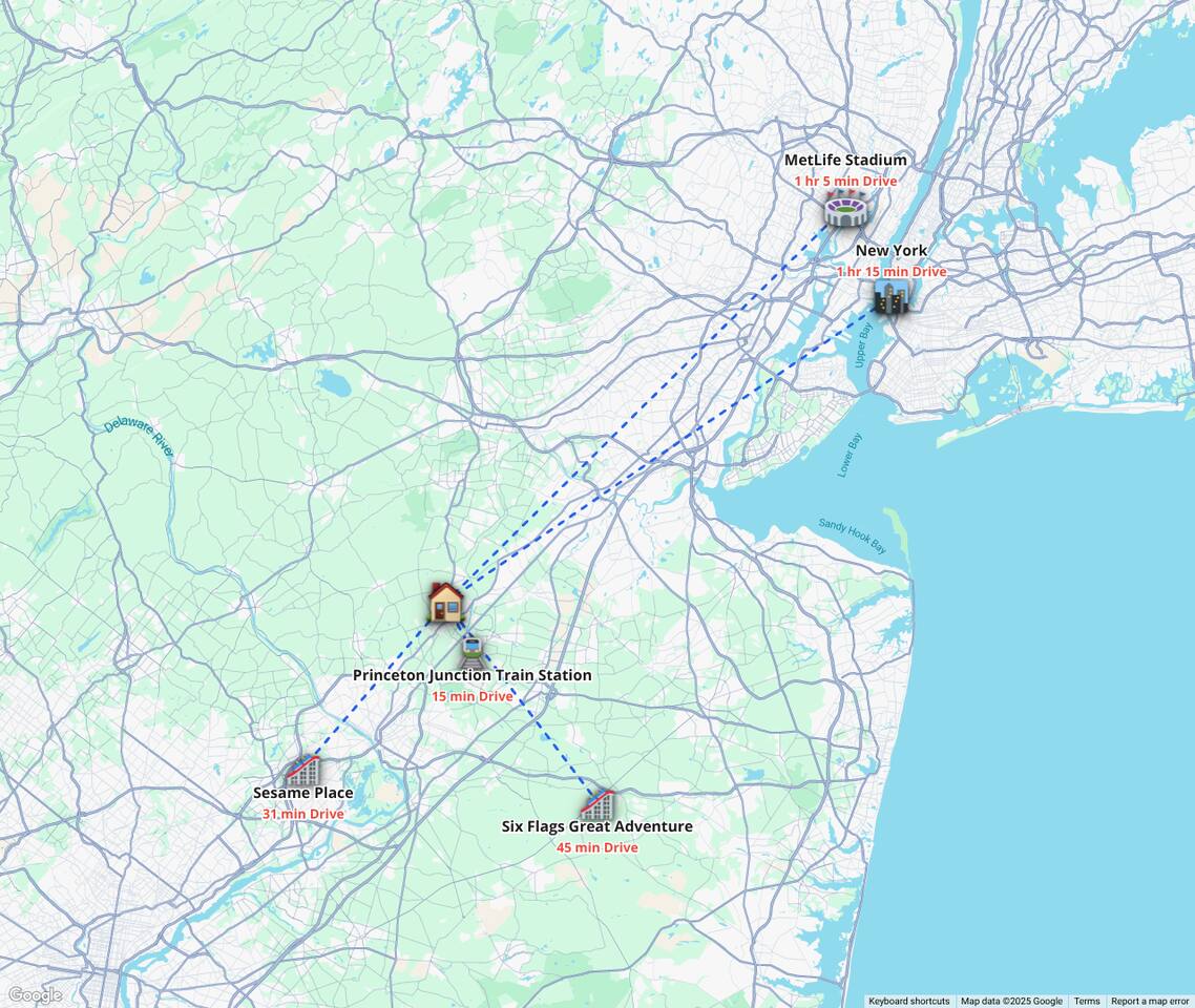 This spacious retreat features a huge private backyard, a full-size game room, and a dedicated gym area—perfect for families, groups, or business travelers. Located just minutes from downtown Princeton, you’ll enjoy fine dining, boutique shopping, theaters, and family-friendly attractions. Plus, the Princeton Shopping Center is only a 2-minute drive, offering everything from groceries and bagels to coffee shops, spas, salons, and pharmacies—making your stay as convenient as it is unforgettable.