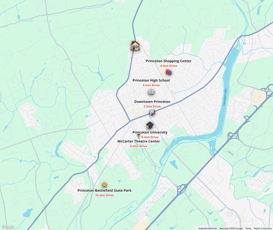 Short 4-minute drive or uber to downtown Princeton, University, Highschool, and Westminster Conservatory. A 2-minute drive from the Princeton Shopping Center ( Second Downtown of Princeton) where there is NY Sports Club, McCaffrey's Supermarket, Bon Appetite European store, Cross Culture Ethnic Indian Cuisine, Shanghai Park Chinese Restaurant, Famous Nomad Pizza, Chopt Creative Salad, Dunkin Donuts, Free Bus, and more… A 2-minute drive from the Princeton Police Department and Princeton Center which includes a Dominos Pizza, Mayflower Cleaners, Siyu Spa, a Convenience store, and Princeton Cleaners & Tailor